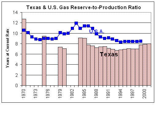 Natural gas reserve-to-production ratios have been fairly constant in recent years for both the U.S. and Texas, and stand at 8.7 years and 7.4 years, respectively, for the year ending in 1999.