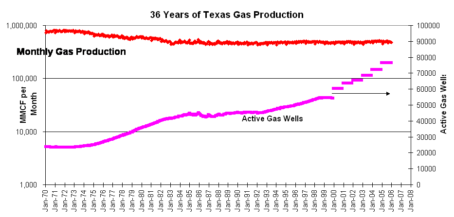 After showing a decline from about 1974 to the early 1980s, gas production in Texas has been fairly constant at about 510 BCF per month (6,200 BCF per year). But that production rate has been maintained by more than doubling the number of gas wells. Active gas wells increased from 23,700 in 1970 to 59,000 at the end of 1999.