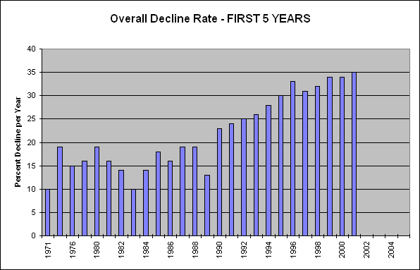 The study was limited to only Texas gas completions from 1971 through 1999, the latest full year in which production data was available. Although casinghead gas production from oil wells was not included in the study, that gas comprises about 18% of the total Texas production, a percentage that continues to decrease. Since the state tracks casinghead gas production on a lease basis rather than by well, it makes it difficult to analyze the performance of new wells separate from old. Wells in state waters were included in the data set but Federal offshore leases were not. For the most part, a gas completion represents a single well in the way production data is reported to the Texas Railroad Commission (RRC). There are certainly instances of multiple completions in the data sets but many fields in the state allow either commingling or the combining of multiple reservoirs as a single completion. In this study the data source is the production volumes as reported to the RRC, generally on a well basis and the term well is used interchangeably for completion. For each year from 1971 to 1999, the new gas completions for those years were segmented into single year classes. Those classes ranged from a maximum of 6,034 completions in the class of 1982 to a low of 1,934 in 1971. Typically the class size was in the 3,000-4,000 range.
