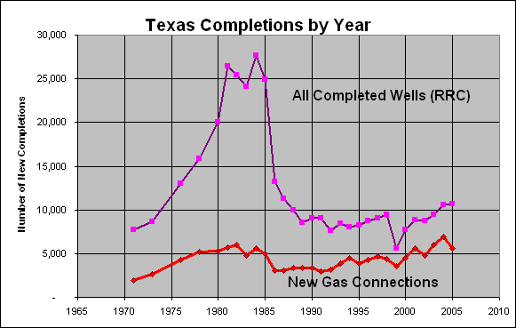 There have been substantial changes in the decline profiles of wells drilled in Texas over the last 30 years. This study indicates that for new Texas gas wells, the decline rates in the early years are now on the order of 50% per year. Improved drilling and completion technology have increased the initial production from the wells. Reserves developed per completion are about 1 BCF per well and show a continuing slow decrease. At those average reserves, volumetric replacement of the states annual gas production requires the completion of an estimated 6,100 new gas wells compared with only 3,566 new gas wells in 1999 and 4,580 new gas wells in the year 2000. (Casinghead gas from oil wells, which was not part of this study, also contributes to gas additions). Without an increase in the number of completions, the combined effects of poorer wells, contributing an increasing percentage of the Texas gas supply may make it difficult to sustain the states gas production.