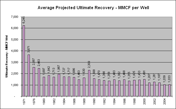 The average rate-vs.-time plot for each class-year of wells was used to project an ultimate gas recovery, assuming operating costs of $1,600/well/month, $4.00/mcf gas price and 80% NRI. Average projected recovery declined from 6,245 MMCF per well in 1971 to 1,019 MMCF per well in 1998. The trend shows a slow decrease in ultimate gas recovery since 1980. These figures for Texas wells are in fair agreement with the data from the Energy Information Administration (E.I.A.)2 which indicate additions from extensions and new discoveries of 10,807 BCF in 1999 (extensions + new discoveries) as a result of the completion of 9,621 new gas wells or an average addition of 1,123 MMCF per well for the entire U.S. The E.I.A. data includes high reserve offshore wells that likely carry higher reserves than those in the study group.
