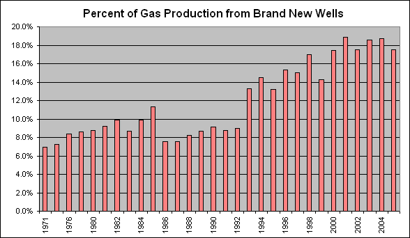 In addition to a trend of higher initial production, significantly higher decline rates and lower ultimate recovery, the new wells are contributing more to the Texas gas supply. Figure 14 shows the proportion of gas produced in each year that came from wells completed in that year. Until the early 1990s, typically 8% of the gas production came from new wells drilled that year. But since 1993 that percentage has increased sharply to about 15% of the states gas supply coming from new wells.