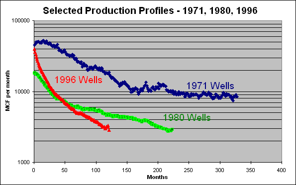 Three selected production decline profiles are shown in Figure 9 for the years of 1971, 1980 and 1996. It is clear that although the initial well productivity increased from 1980 to 1996, depletion is taking place at a faster rate and the expected life of the newer wells will be much shorter than older vintage wells. The newer wells consistently show more hyperbolic tendencies but with significantly steeper decline rates in the early years. This pattern is evident throughout each class-year of gas wells.