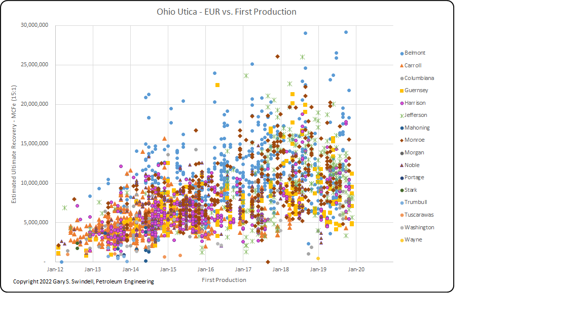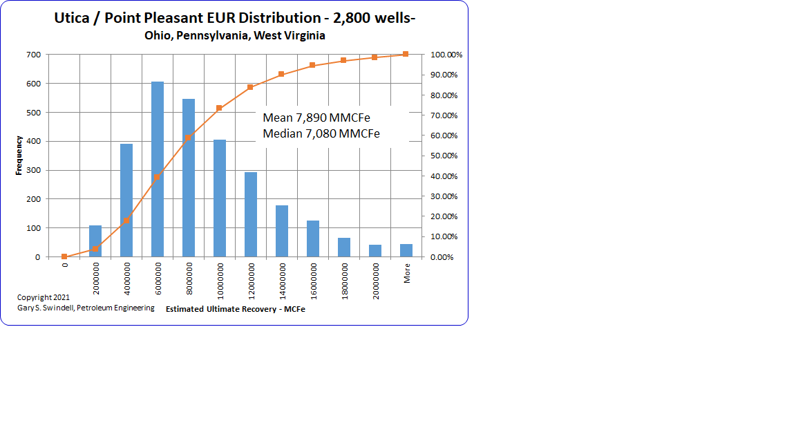This study summarizes the results of an evaluation of the estimated ultimate recovery (EUR) for all horizontal Utica and Point Pleasant Shale completions from 2008 through 2020 in Ohio, Pennsylvania and West Virginia. Individual well rate vs. time plots using publically available production data through March 2021 were used to forecast the EUR of 2786 wells - 2459 in Ohio, 296 in Pennsylvania and 31 in West Virginia. The primary study objective was to determine the distribution and trends in EUR.